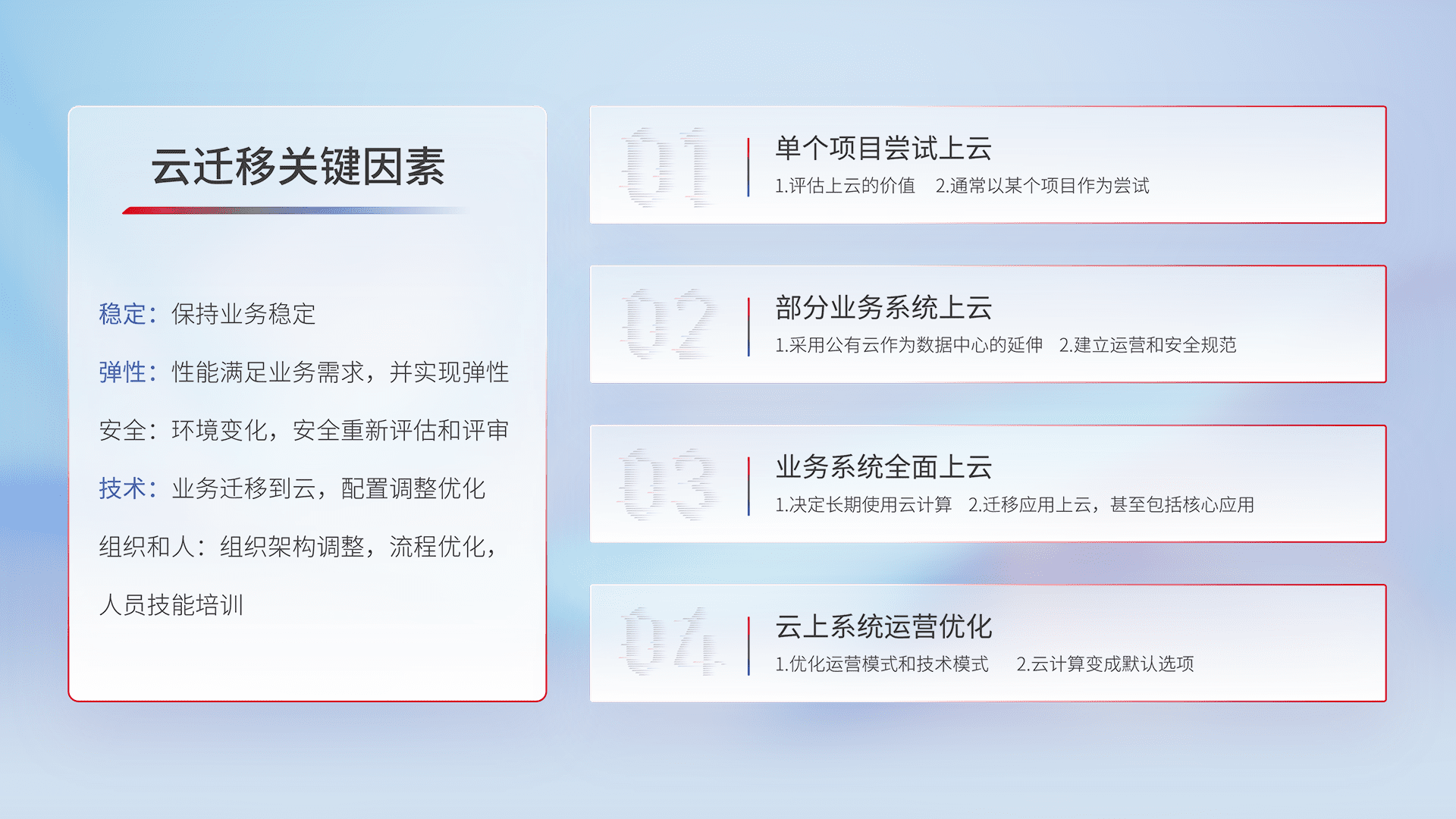 结合实际业务,,,,从规划设计、、云平台选型、、云原生改造、、数据迁移、、、、集成交付,,,,迁移全过程为客户识别最佳上云路径,,,做好风险识别管理,,,设计网络架构、、身份权限、、安全审计合规、、、、操作审计、、、、日志审计、、、、监控告警策略、、、、多站点容灾设计等,,,,对云上基础设施进行整体规划,,提升IT治理水平,,,,以满足弹性、、、、高可用、、高性能的需求。。。