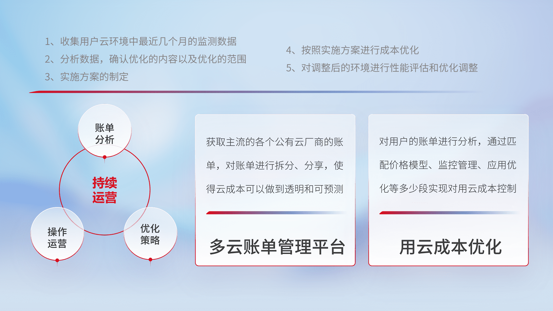 通过多云纳管,,,,以统一的资源数据模型把客户的云资源进行抽象和封装,,,进而实现对多云资源的统一操作,,,,保障云资源管理的可靠性、、稳定性与可用性。。。量身定制化运维内容,,,,配置、、开发运维、、补丁管理、、、、备份、、、监控、、、、认证和访问管理、、、、审计和日常巡检等,,,,保障在用云过程中的可靠度,,稳定度以及高可用率。。。。