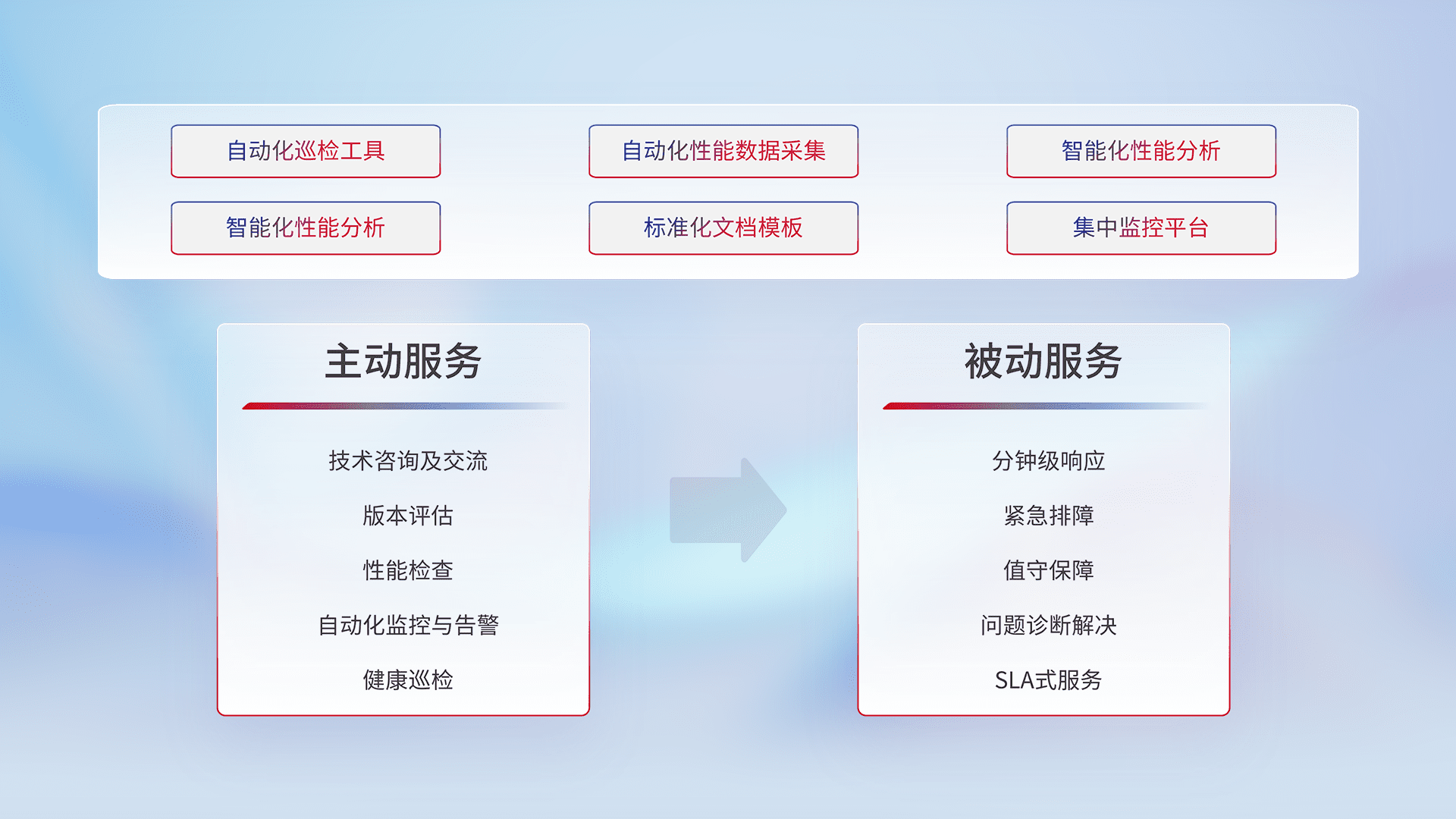 智能化工具和标准化文档,,,,保障服务质量,,,,提供主动服务(包含技术咨询、、、、版本评估、、、、性能检查、、、自动化监控与告警、、健康巡检)和被动服务包含(分钟级响应、、紧急排障、、、值守保障、、问题诊断解决、、、SLA服务)。。。。